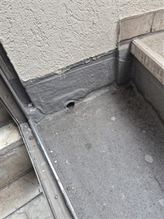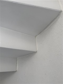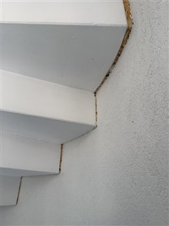 Dernière marche d'escalier tournant Terrassière. Fuite d'eau - rebouchage puis acryl structuré
